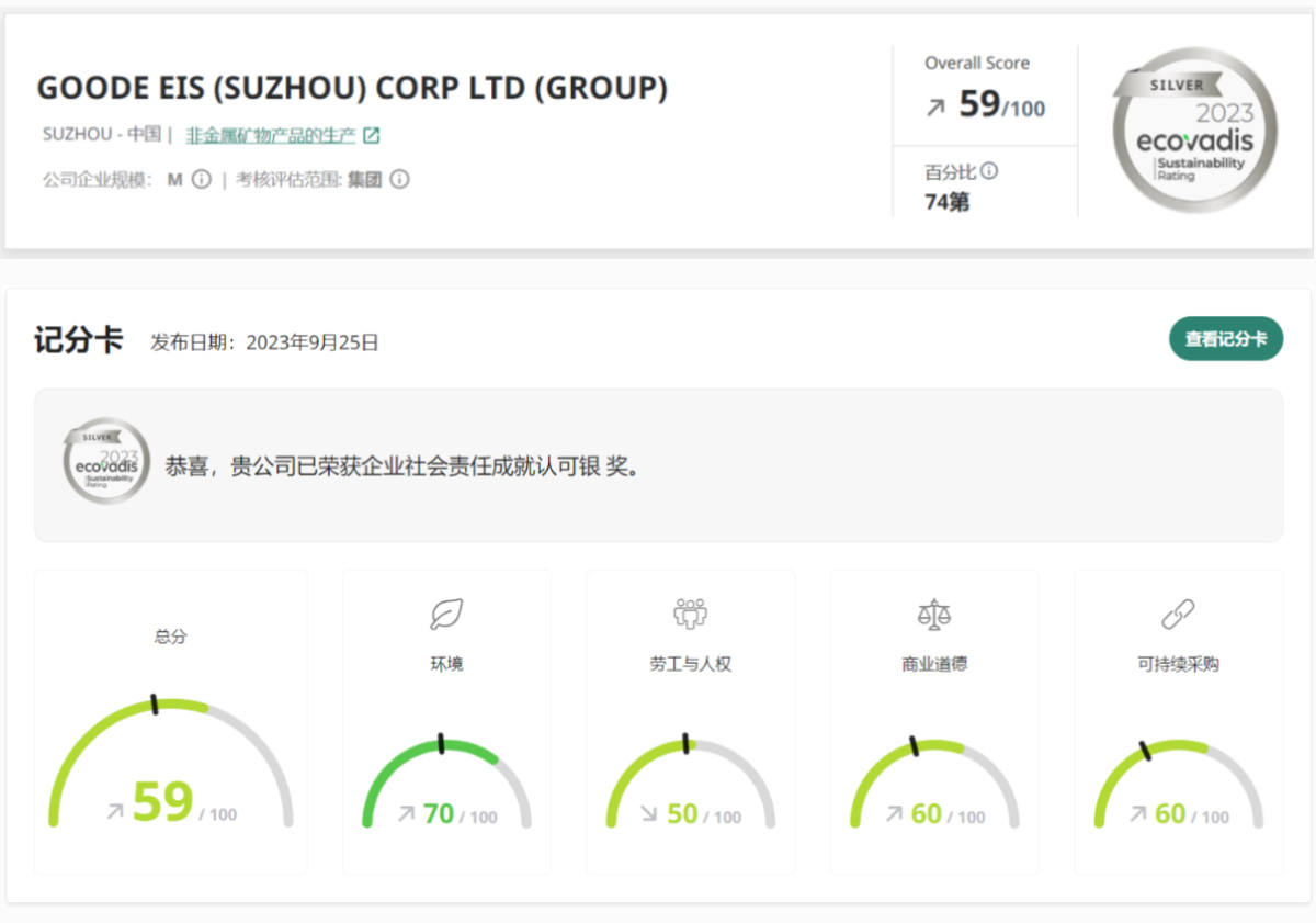 Le déanaí, Goode EIS (Suzhou) Corp LTD. (Goode Electrical Materials) 59 pointe a bhaint amach i rátáil deimhniúcháin inbhuanaitheachta Ecovadis 2023 agus bhuaigh sé an bonn airgid, rangú 26% de na 85,000 fiontar a bhí rannpháirteach sa mheasúnú domhanda agus an 8% is fearr sa tSín.